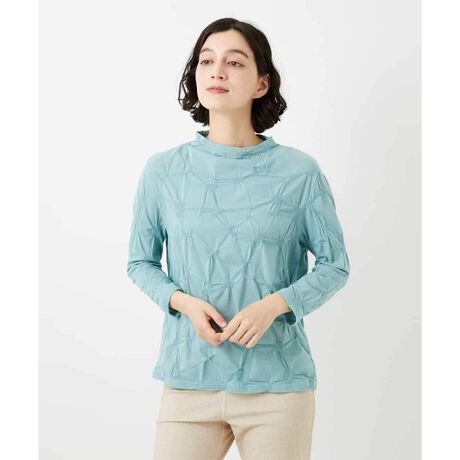 タック柄の凹凸でアルファベットを表現した、表情豊かなデザイン素材。見た目のおしゃれさだけでなく、さらっとした清涼感のある肌触りとストレッチ性を兼ね備え、快適な着心地を実現しています。ボトルネックデザインで首元をすっきり見せつつ、ボトムを選ばずコーディネートしやすいのも魅力です。1枚での着用はもちろん、ジャケットやカーディガンのインナーとしても活躍します。季節を問わず長く使える、着回し力の高い万能アイテムです。同素材のフレンチスリーブカットソー【NHKGE47170】もございます。