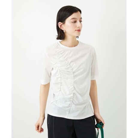 前身頃に大胆なシャーリングを大き目のカーブラインで表現したプルオーパーです。肩回りはスッキリとコンパクトな仕様で、一枚着からジャケットやカーディガンなどのインナーとしても使える汎用性の高いカットソーです。シャーリングデザインの凹凸や陰影が視線を分散させるためボディラインを拾いにくく、体型カバーが叶います。身体にやさしくフィットしながらも窮屈感がなく、動きやすいのが魅力です。生地の凹凸のおかげで肌に張り付きにくいため、汗ばむ季節でもサラサラとした快適な肌触りが続きます。
