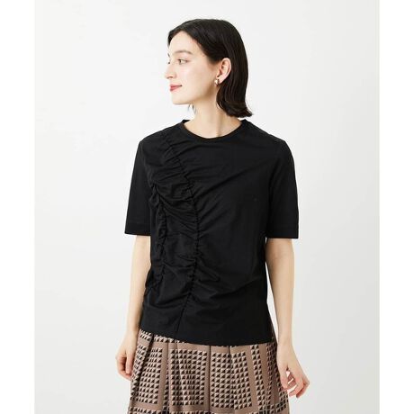 前身頃に大胆なシャーリングを大き目のカーブラインで表現したプルオーパーです。肩回りはスッキリとコンパクトな仕様で、一枚着からジャケットやカーディガンなどのインナーとしても使える汎用性の高いカットソーです。シャーリングデザインの凹凸や陰影が視線を分散させるためボディラインを拾いにくく、体型カバーが叶います。身体にやさしくフィットしながらも窮屈感がなく、動きやすいのが魅力です。生地の凹凸のおかげで肌に張り付きにくいため、汗ばむ季節でもサラサラとした快適な肌触りが続きます。