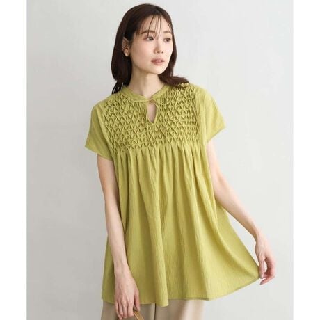 前身頃にハンドスモッキングを施した贅沢なブラウス。職人がひと針ひと針手仕事で仕上げています。襟ぐりは着用時に自然と開くようパターンで調整し、長めのフレンチスリーブですっきりとした印象に仕上げました。