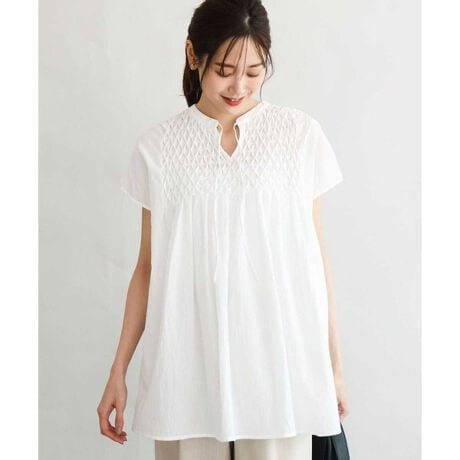 前身頃にハンドスモッキングを施した贅沢なブラウス。職人がひと針ひと針手仕事で仕上げています。襟ぐりは着用時に自然と開くようパターンで調整し、長めのフレンチスリーブですっきりとした印象に仕上げました。