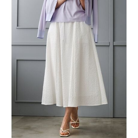 ワッフルのような立体感とほのかな透け感を活かしたギャザースカート。軽やかな素材感が、動くたびにやわらかな表情を生み出します。ウエストはすっきりと仕上げ、分量感がありながらも上品なシルエットに。通気性にも優れ、春夏に心地よく着用いただける一枚です。