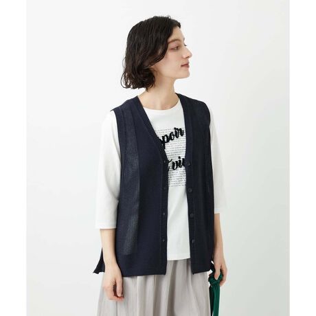 ガーター編みと透かし柄を合わせ、ホールガーメントでお作りしたVネックのニットベストです。コットン100%よりも柔らかく、チクチク感がないため、ノースリーブとして素肌に当たっても心地よく着用いただけます。薄手のカットソーやシャツの上に重ねるだけで、気になるお腹周りを隠しつつ、縦のラインを強調してスッキリ見せてくれます。鎖骨まわりがほどよく露出され、視線が縦に落ちるため、フェイスラインがスッキリ見えます。