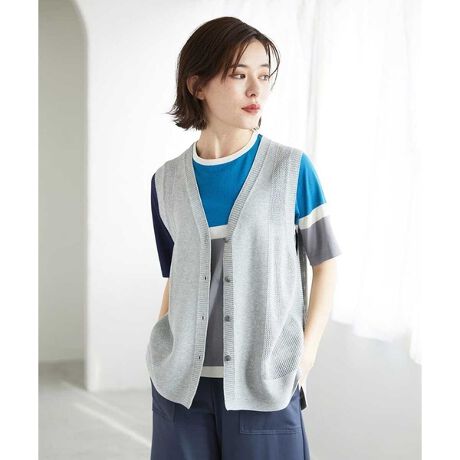 ガーター編みと透かし柄を合わせ、ホールガーメントでお作りしたVネックのニットベストです。コットン100%よりも柔らかく、チクチク感がないため、ノースリーブとして素肌に当たっても心地よく着用いただけます。薄手のカットソーやシャツの上に重ねるだけで、気になるお腹周りを隠しつつ、縦のラインを強調してスッキリ見せてくれます。鎖骨まわりがほどよく露出され、視線が縦に落ちるため、フェイスラインがスッキリ見えます。