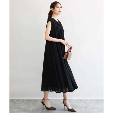 幾何柄のレースが大人見えするワンピース。フロントにタックを入れ、裾にかけてきれいに広がるAラインシルエットに仕上げました。身体のラインを拾わず涼しく着られるのも嬉しいポイント。ノースリーブですが、肩から少し出る袖丈が一枚でも着こなしやすい。