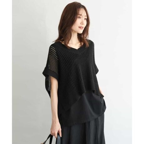 ざっくりとしたメッシュ編みはドライタッチで涼しげ。透け感があるのでインナーの色で雰囲気を変えて楽しめます。タンクトップは肌触りの良いコットン100の素材を使用。