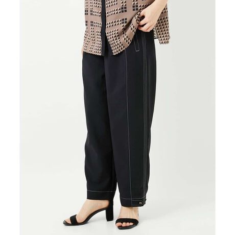 サイドのラインと前の切り替え線で、ほどよくカーヴィーなシルエットに仕上げたワイドテーパードパンツです。白でコントラストを効かせたステッチワークがスタイリッシュな主役級のワークパンツです。裾のボタンの留める位置を変えることで、2WAYシルエットを楽しめるオシャレなアイテムです。ボタンを留めれば、旬な裾絞りのパラシュートシルエットに、外せばリラックス感のあるワイドストレートへと早変わりします。
