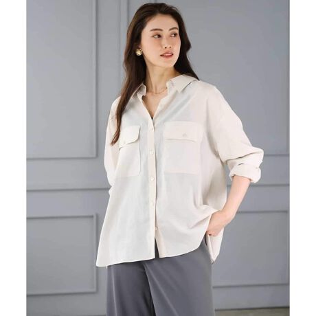 程よいハリとしなやかさ、さらにシアー感を併せ持つツイル素材を使用したシャツ。素材のほどよい反発感により、メンズライクなゆったりとしたサイズ感でもルーズに見えず、立体的なフォルムをキープします。大きめのフラップポケットがアクセントになり、ワークテイストを感じさせつつも、シアーな素材感で軽やかな印象に。羽織としても活躍し、フロントをインすれば女性らしいニュアンスのある着こなしも楽しめます。長袖でも重く見えず、袖をラフにたくし上げた抜け感のあるスタイリングがおすすめ。シーズンを通して幅広く着回せる一着です。