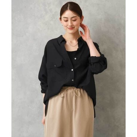 程よいハリとしなやかさ、さらにシアー感を併せ持つツイル素材を使用したシャツ。素材のほどよい反発感により、メンズライクなゆったりとしたサイズ感でもルーズに見えず、立体的なフォルムをキープします。大きめのフラップポケットがアクセントになり、ワークテイストを感じさせつつも、シアーな素材感で軽やかな印象に。羽織としても活躍し、フロントをインすれば女性らしいニュアンスのある着こなしも楽しめます。長袖でも重く見えず、袖をラフにたくし上げた抜け感のあるスタイリングがおすすめ。シーズンを通して幅広く着回せる一着です。