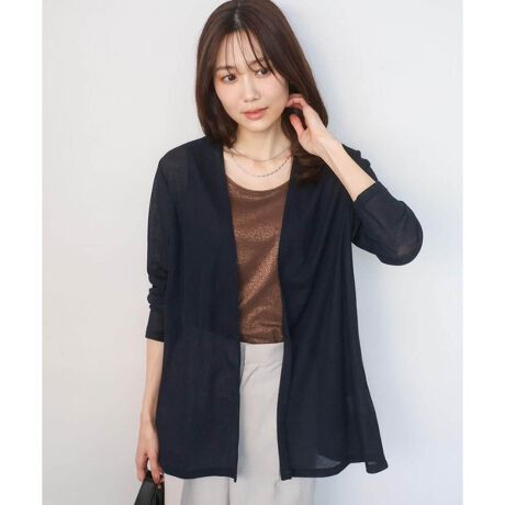 釦のない着流しタイプのカーディガン。縦長のIラインを作り出し、すっきりとした印象を与えます。衿元を削ぎ落としたミニマルなデザインです。気になる二の腕をカバーしつつシアーな質感が軽やかさを演出します。