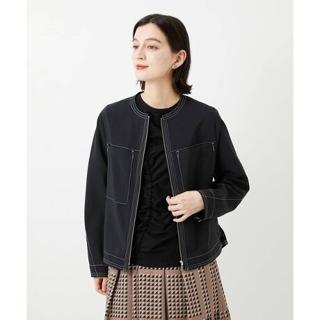 シャープな印象のノーカラージップアップジャケットです。前はセットインスリーブ風にコンパクトに、後ろはドルマンスリーブで立体的でゆとりのあるフォルムになっています。ジップアップ仕様なので着脱がしやすく、季節の変わり目も簡単に温度調節ができるところも魅力的です。白でコントラストを効かせた配色ステッチがポイントになってスタイリッシュな印象にしてくれます。テーラードジャケットほど堅苦しくなく、カーディガン感覚で気軽に羽織れるため、お仕事から休日まで幅広く活躍します。