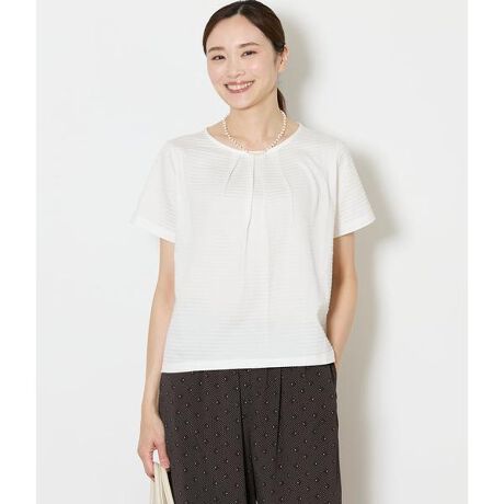 フロントにタックを施したラウンドネックの半袖プルオーバー。胸元のタックが自然な立体感を生み、顔まわりを華やかに見せてくれます。ジャケットインにも対応できるきちんとデザインシンプルなシルエットながら素材の表情が引き立ち、1枚でもきちんと感のある着こなしに。ジャケットインにもおすすめです。