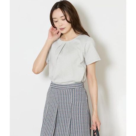 フロントにタックを施したラウンドネックの半袖プルオーバー。胸元のタックが自然な立体感を生み、顔まわりを華やかに見せてくれます。ジャケットインにも対応できるきちんとデザインシンプルなシルエットながら素材の表情が引き立ち、1枚でもきちんと感のある着こなしに。ジャケットインにもおすすめです。
