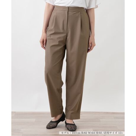 程よいゆとりを持たせつつ、すっきりとした美脚シルエットを追求したテーパードパンツ。楽なはき心地でありながら、布帛見えする上品な表情と、フロントのファスナー仕様で、きちんと感を大切にしました。伸縮性のある素材で動きやすく、長時間の着用でも疲れにくいのが特長です。ウエストは後ろゴム仕様で、トップスをインしてもすっきり。ブラウスと合わせて通勤に、ニットと合わせて休日のきれいめカジュアルにと、オンオフ問わずに活躍します。ご自宅で手軽にお手入れできるのも、日々の着こなしに嬉しいポイントです。
