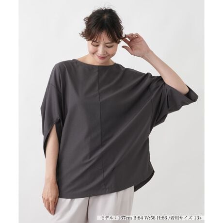 まるで折り紙のように、緻密に畳まれた袖のデザインが素敵なブラウス。気になる二の腕をカバーしながら、装いに華やかさと個性を添えます。一見すると布帛のようですが、実は伸縮性のあるきれいな表情のカットソー素材を使用。エレガントな見た目とストレスフリーな着心地を両立しました。裾の内側にはボタンが付いており、留めることで前裾をボトムインしたかのように見せることも可能。着崩れを気にせず、すっきりとした着こなしが楽しめます。ご自宅での手洗いも可能で、お手入れが簡単なのも魅力です。
