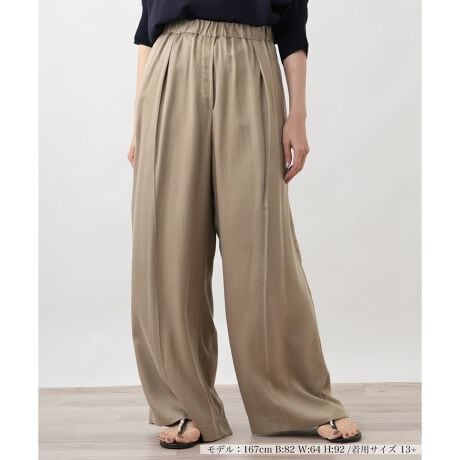 まるでとろけるような、滑らかなサテン素材で仕立てたワイドパンツ。美しいドレープ性が、高級感とリラックスした雰囲気を兼ね備えた、大人のためのリッチな一本です。センタープレスを施すことで、ワイドシルエットながらもすっきりと洗練された印象に。ウエストは総ゴム仕様で、快適なはき心地を約束します。光沢のある素材は、シンプルなトップスを合わせるだけでコーディネートを華やかに演出。お家でのリラックスタイムから、少しおしゃれをしたいお出かけまで、幅広いシーンで活躍。贅沢な素材感を日常でお楽しみください。