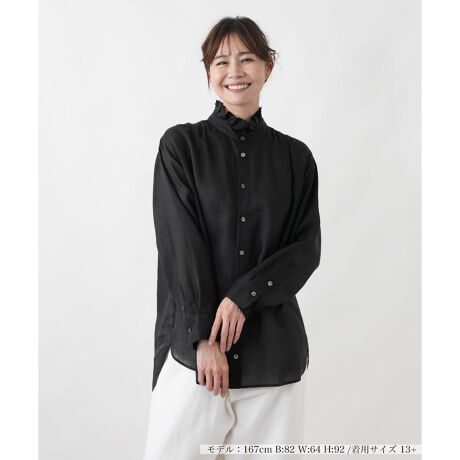 細番手の糸で織り上げた、きれいな光沢感と繊細な透け感が美しいブラウス。見た目にも着心地にも清涼感あふれる素材を採用しました。デザインの主役は、衿元にあしらわれたランダムなフリル。アシンメトリーに配置された贅沢なディテールが、顔周りを華やかに彩り、アクセサリーなしでも着映えする存在感を放ちます。一枚でさらりと着るだけで、エレガントで女性らしいスタイリングが完成。ジャケットのインナーとしても、フリルをのぞかせて素敵なアクセントになります。ご自宅でのお手入れも可能で、気軽にデイリー使いできるのが嬉しい点です。