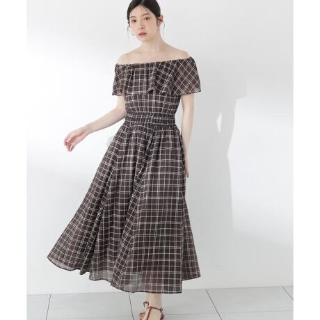シアーチェック柄が目を引くオフショルダーワンピース。大人っぽいカラーで甘さをおさえており、デイリーにも着やすいデザインです。ウエストの華奢なリボンが女性らしさを演出。ぐるっと全周ゴム仕様のオフショルデザインで、快適な着心地です。