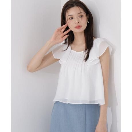 袖のラッフルが目を引くブラウス。襟元のタックから裾にかけてふんわり広がるシルエットが、女性らしい印象に見せてくれます。短丈デザインなのでバランスが取りやすく、アウトスタイルがおすすめです。