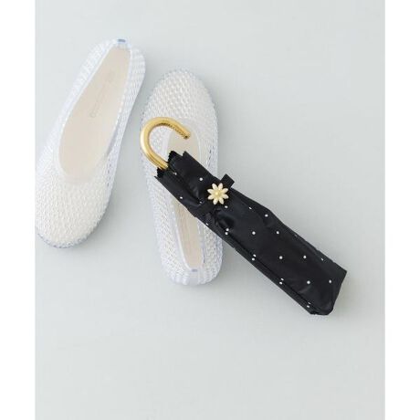 ドット柄とスカラップのフチがガーリーな長日傘。ゴールドのフラワーボタンがワンポイント。