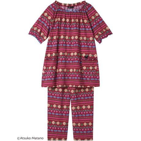 [型番:HDT125]・綿100%の天竺素材を使用・コントラストの効いたカラーリングで、オリエンタル風の素敵なテキスタイル・ポケットから顔をのぞかせている黒猫のアップリケがデザインポイント・おうち時間にぴったりな、リラックス感のあるシルエット・ネック・袖口ゴム入替設計※お洗濯は、必ず「取扱い表示」にしたがってください。