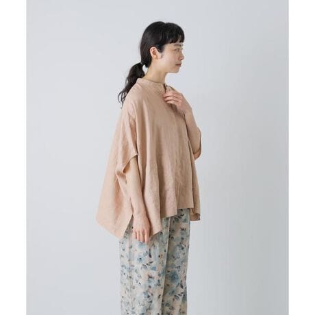 程よい厚みのリネン生地はドライタッチでこれからの季節にピッタリ。身幅を広く取ったワイドシルエットが風通しの良い着心地です。上半身のラインを拾いにくいのも嬉しいポイント。すっきりとしたスタンドカラーできちんと感を添えています。ボタンの見えない比翼仕様を採用しミニマルで大人っぽい印象に。後ろにはタックが施され、さり気ない立体感を生んでいます。前を開ければ羽織ることも可能でお出かけに重宝する1枚。トップスながらも両サイドには便利なポケットが付いています。
