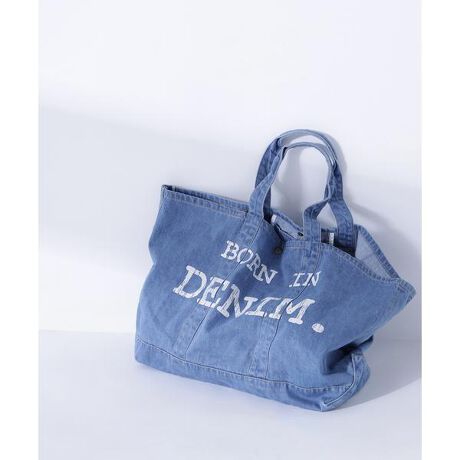 ウォッシュのかかったデニム生地をざっくりと使用したヴィンテージ感漂うトートバッグ。ロゴの意味「BORN IN DENIM・デニムから始まる」のようなニュアンスワードのプリントがアクセントになっています。A4サイズ収納可能です。デニム製品は摩擦により色移りする可能性がございます。白や淡色系衣料品や雑貨などご着用の際は十分にご注意ください。※モデルの着用画像の場合、光の当たり具合により、実際の色味と異なって見えることがございます。色味は、商品単体の画像をご参照ください。