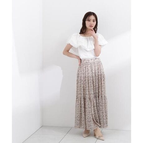 プリーツ加工の小花柄が映えるロングスカート。存在感のあるボリュームシルエットで、シンプルなトップスと合わせるだけでサマになる一枚です。後ろウエストはゴム仕様で動きやすく、デイリーのカジュアルコーデにおすすめです。