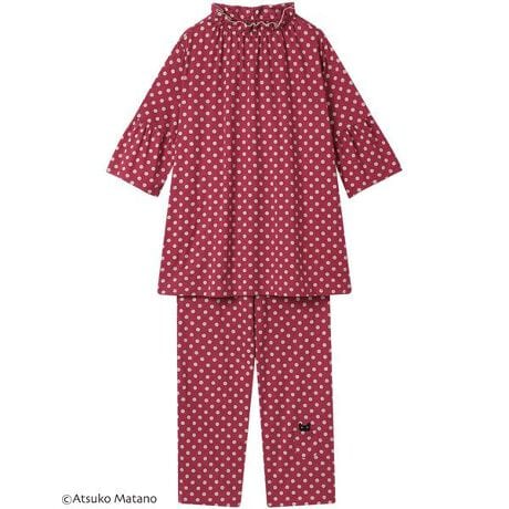 [型番:HDT228]・綿100%の天竺素材を使用・カントリー風のドットが素敵なテキスタイル・ボトムのポケットから顔をのぞかせている黒猫のアップリケがデザインポイント・トップス両サイドにポケットあり・ネックゴム入替設計※お洗濯は、必ず「取扱い表示」にしたがってください。