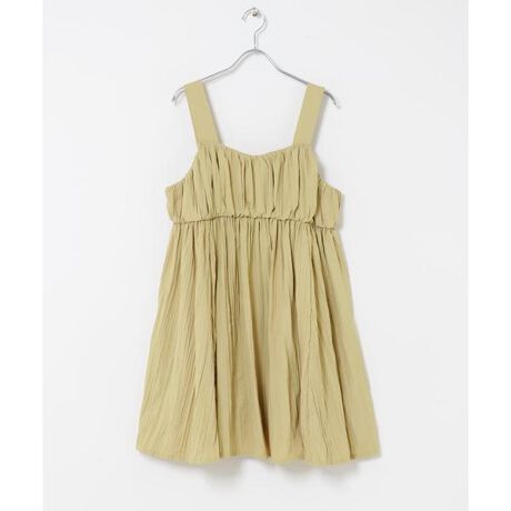 スタイルアップ見え効果が期待できる、クリンクル加工が目を惹くミニワンピース。胸下切り替え下部分は、少しバルーン仕様にすることで動きのあるシルエットに仕上げました。また、太めに設定された肩紐は釦で長さ調整可能です。後ろゴムになっているところもポイント。1枚でさらっとヘルシーに着ていただくのはもちろん、タンクトップ合わせもおすすめです。