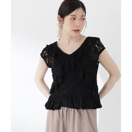 フロントのラッフルデザインがトレンド感のあるレースカットソー。コンパクトなシルエットで、アウトスタイルもバランス良く決まります。程よい袖丈のフレンチスリーブで、気になる二の腕をカバー。夏本場までロングシーズン活躍します。