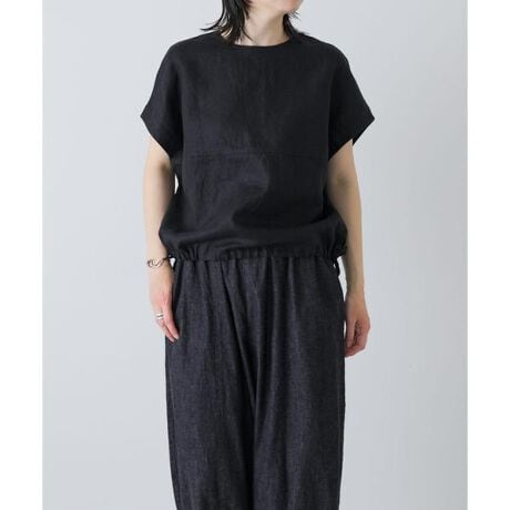 薄着の季節に着映えるトップスが届きました。胸元に切り替えがある丸いパターンが特徴的で、着た時のシルエットに奥行きが生まれます。肩まわりをカバーする穏やかなフレンチスリーブも大人に嬉しいデザインです。裾はドローコード仕様を採用しアクセントを添えました。そのままストレートに、絞ってブラウジングしたりとスタイリングに合わせて変化をお楽しみください。