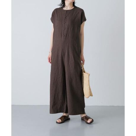 いつの季節も手に取りたいオールインワンがリネン素材で登場です。サラッとしていてこれからの時期に寄り添う肌触り。気温の上昇に合わせたフレンチスリーブのデザインです。程よいハリが体型を拾いにくく、ゆとりがありながらもスッキリとしたシルエットに。コンパクトな襟ぐりとくるみ釦が上質なムードを後押し。肌寒い時にはジャケットやカーディガンを羽織ってお楽しみください。簡単にスタイリングが完成するおすすめのアイテムです。