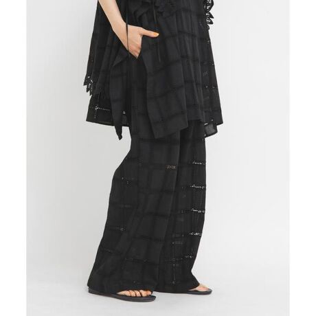 ハンカチを縫い合わせたようなブロッキング刺繍が、華やかな印象を放つデザインパンツ。ウエストはオールゴム仕様でリラクシーな穿き心地が叶いつつ、シルエットはすっきりと仕上げました。膝あたりまで裏地が付いているので透け感もなく穿いていただけます。シンプルなトップスを合わせるだけでこなれ感が叶うアイテムです。