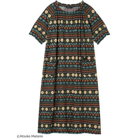 [型番:HNT126]・綿100%の天竺素材を使用・コントラストの効いたカラーリングで、オリエンタル風の素敵なテキスタイル・ポケットから顔をのぞかせている黒猫のアップリケがデザインポイント・ネック・袖口ゴム入替設計※お洗濯は、必ず「取扱い表示」にしたがってください。