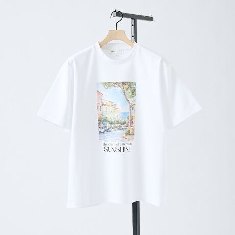 程よくゆとりのあるシルエットに、地中海のカラフルな街並みを水彩画タッチで表現したグラフィックTシャツ。