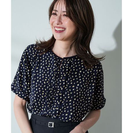 ・ドルマンシルエットが肩まわりや二の腕をさりげなくカバーし、リラックス感のあるきれいめブラウス・フロントにはキーネックと縦ラインを強調するタックを施し、顔まわりに程よい抜け感とシャープさをプラス・後ろ襟ぐりにはタックを2本入れて、後ろ姿にも立体感をプラス・無地2色は襟ぐりがバイカラーデザイン、ストライプ柄2色・幾何柄2色も展開・前後でレングス差があり、バランスよく着こなせるデザイン