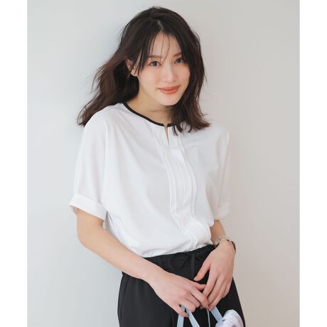 ・ドルマンシルエットが肩まわりや二の腕をさりげなくカバーし、リラックス感のあるきれいめブラウス・フロントにはキーネックと縦ラインを強調するタックを施し、顔まわりに程よい抜け感とシャープさをプラス・後ろ襟ぐりにはタックを2本入れて、後ろ姿にも立体感をプラス・無地2色は襟ぐりがバイカラーデザイン、ストライプ柄2色・幾何柄2色も展開・前後でレングス差があり、バランスよく着こなせるデザイン