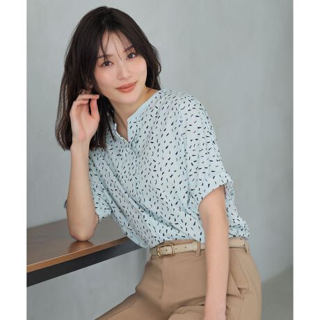 ・ドルマンシルエットが肩まわりや二の腕をさりげなくカバーし、リラックス感のあるきれいめブラウス・フロントにはキーネックと縦ラインを強調するタックを施し、顔まわりに程よい抜け感とシャープさをプラス・後ろ襟ぐりにはタックを2本入れて、後ろ姿にも立体感をプラス・無地2色は襟ぐりがバイカラーデザイン、ストライプ柄2色・幾何柄2色も展開・前後でレングス差があり、バランスよく着こなせるデザイン