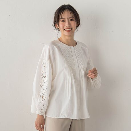 袖にフラワーエンブロイダリーを施した綿素材を使用しています。