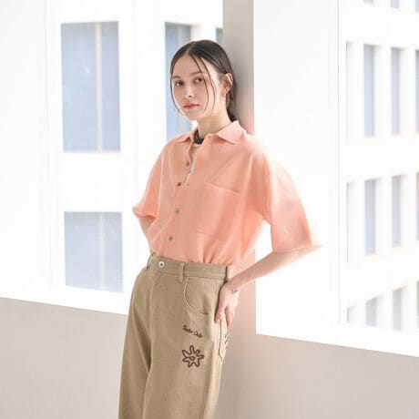 ボリュームのあるボトムとの装いは、タイトなインナーを合わせたりボタンを留めてタックインするのもおすすめです。