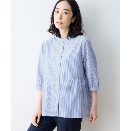 [型番:493088]ふんわり纏う、華やかなペプラムデザインウエストから広がるペプラムデザインが女性らしさを演出するブラウス。ヒップまである着丈が気になる部分をさりげなくカバーし、華やかな印象を添えます。左裾にあしらった鴨の刺しゅうがさりげないアクセントに。首元はバンドカラーですっきりと仕上げ、幅広いシーンに活躍します。