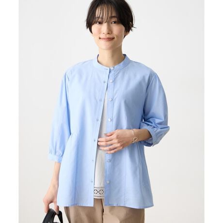 [型番:493088]ふんわり纏う、華やかなペプラムデザインウエストから広がるペプラムデザインが女性らしさを演出するブラウス。ヒップまである着丈が気になる部分をさりげなくカバーし、華やかな印象を添えます。左裾にあしらった鴨の刺しゅうがさりげないアクセントに。首元はバンドカラーですっきりと仕上げ、幅広いシーンに活躍します。