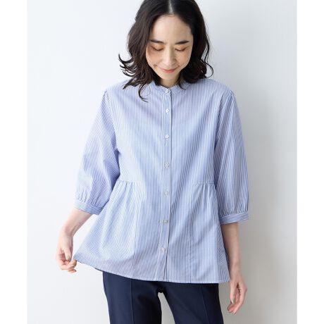 [型番:493088]ふんわり纏う、華やかなペプラムデザインウエストから広がるペプラムデザインが女性らしさを演出するブラウス。ヒップまである着丈が気になる部分をさりげなくカバーし、華やかな印象を添えます。左裾にあしらった鴨の刺しゅうがさりげないアクセントに。首元はバンドカラーですっきりと仕上げ、幅広いシーンに活躍します。