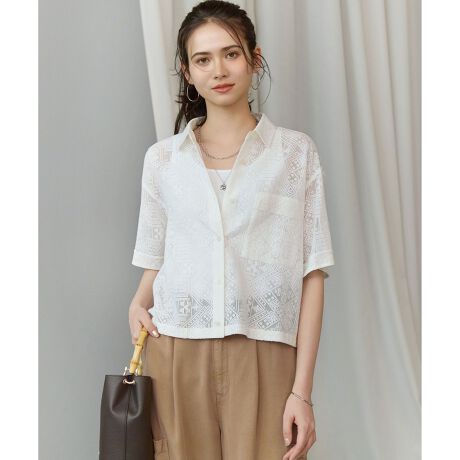 トレンドのレース素材を使用したハーフスリーブシャツです。カジュアルな質感でありながらも、繊細な透け感のあるレースが大人っぽい雰囲気を演出します。フロントボタンを閉めてトップスとして着こなすのはもちろん、軽やかな羽織りとしても活躍する汎用性の高いアイテムです。コンパクトなレングスに仕上げているため、ワイドパンツやボリュームのあるスカートなど、様々なボトムスとバランス良く合わせていただけます。カラーは、爽やかなオフホワイト(#001)と、シックなブラック(#005)の2色展開です。