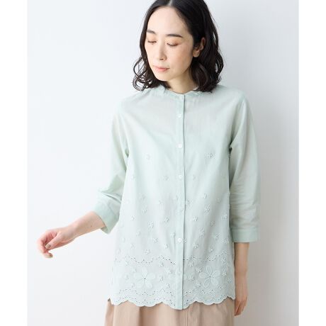 [型番:493083]一枚着をサマにする、こだわりのデザイン立体感のある小花柄刺しゅうで上品に仕上げたブラウス。波打つような裾デザインがシルエットを軽やかに魅せ、女性らしさをプラスします。柔らかな綿100%素材で着心地も良く、一枚で着映えする華やかなアイテムです。