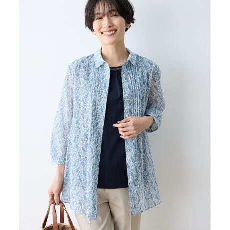 [型番:493076]見た目は上品に、着心地は軽やかに今シーズン初となる軽やかなボイル素材を使ったピンタックブラウスが登場。ペイズリー柄のような花柄で、バラ、スイセン、チューリップ、デイジーの枝が散りばめられた上品なデザインが魅力です。柔らかな綿100%で着心地も良く、一枚着はもちろん重ね着や羽織りものとしても活躍します。