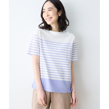 [型番:491265]夏に嬉しい機能付き。夏に映えるパネルボーダー上品なパネルボーダー柄のTシャツ。さらりとした肌触りの綿100%に、UVカット&接触冷感機能付きで真夏でもひんやりと快適に着こなせます。左裾の鴨刺しゅうと、衿ぐり見返しとスリット部分のリバティ生地がさりげない大人可愛さを添えます。パンツやスカートにも合わせやすく、休日から旅行まで幅広く活躍します。