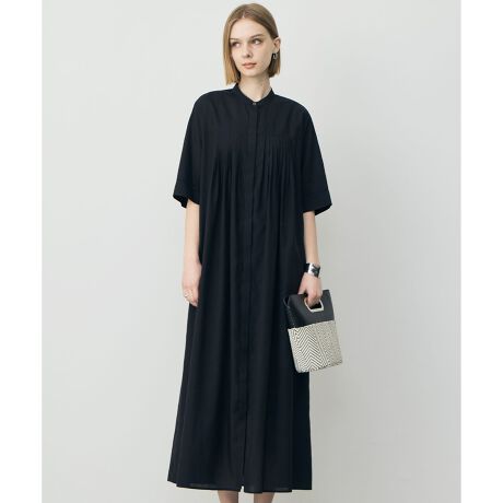 ■デザインすっきりとしたバンドカラーに、繊細なタックデザインを効かせたシャツワンピースです。前立ては比翼仕立てにすることで、クリーンな印象に。袖には特殊な8の字ミシンでさりげないアクセントをプラスし、一枚映えするアイテムに仕上げました。フロントボタンを閉めてワンピースとして一枚で着こなすのはもちろん、ボタンを開けて羽織りアイテムとしても着用でき、幅広いシーンで活躍する万能な一枚です。