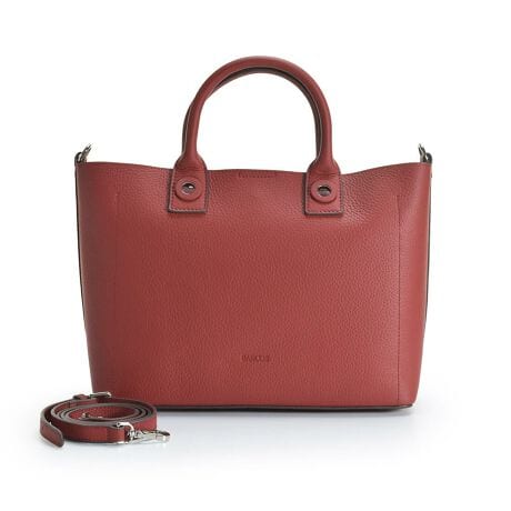 上質なシュリンクレザーを使用したハンドバッグ。どんな装いにも合わせやすいシンプルなデザインのバッグです。ハンドル付け根のはと目がデザインのポイントになっています。仕分けがしやすい3層構造を採用し、内部ポケットも充実している使い勝手の良いハンドバッグ。A4書類も収まるので、普段使いからお仕事まで、様々なシーンで使用可能です。底面にはレザーパッチが付いているので、バッグを置いたときに大きな音がならない構造になっています。ハンドバッグとしても、付属のショルダーベルトを付けて肩かけとしても使用可能です。